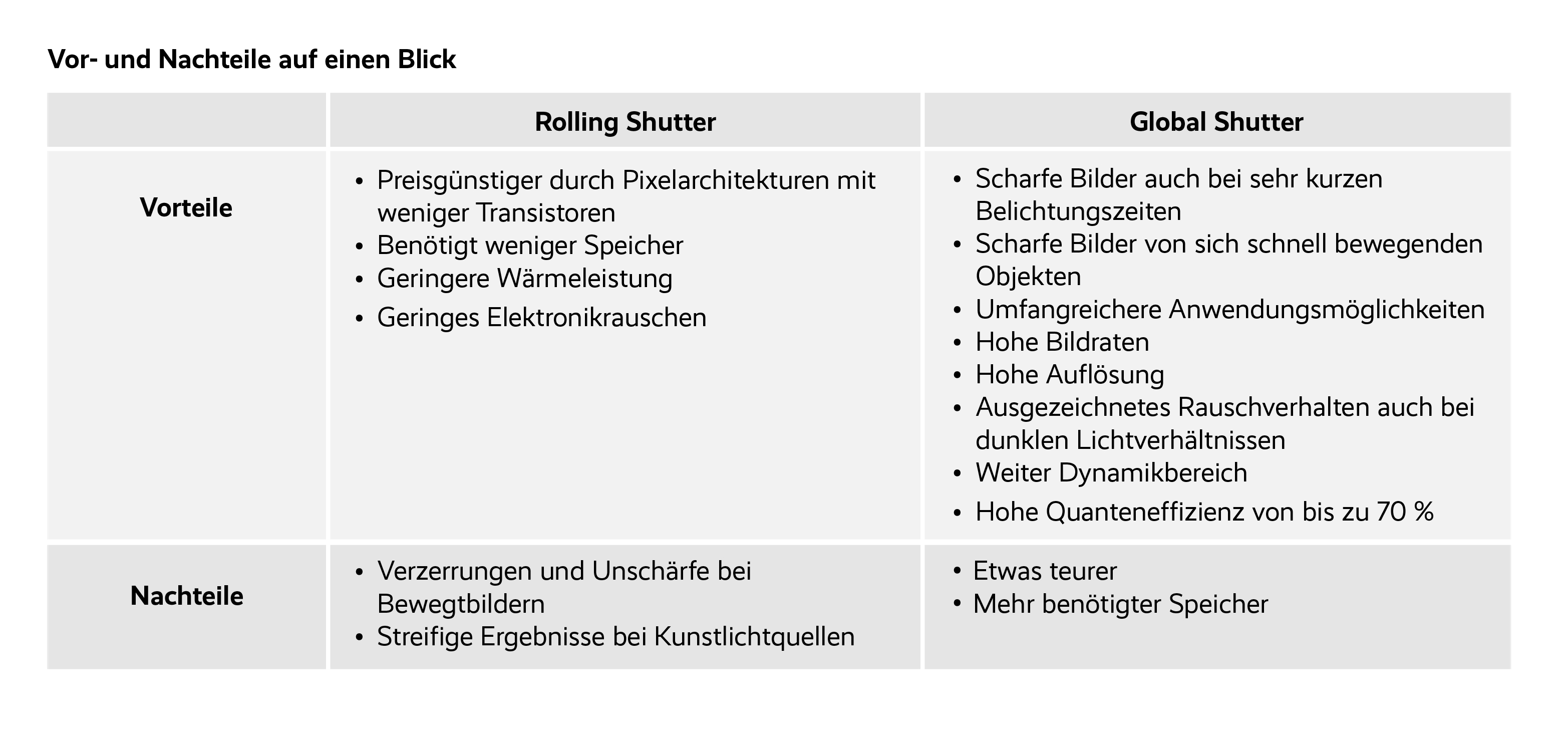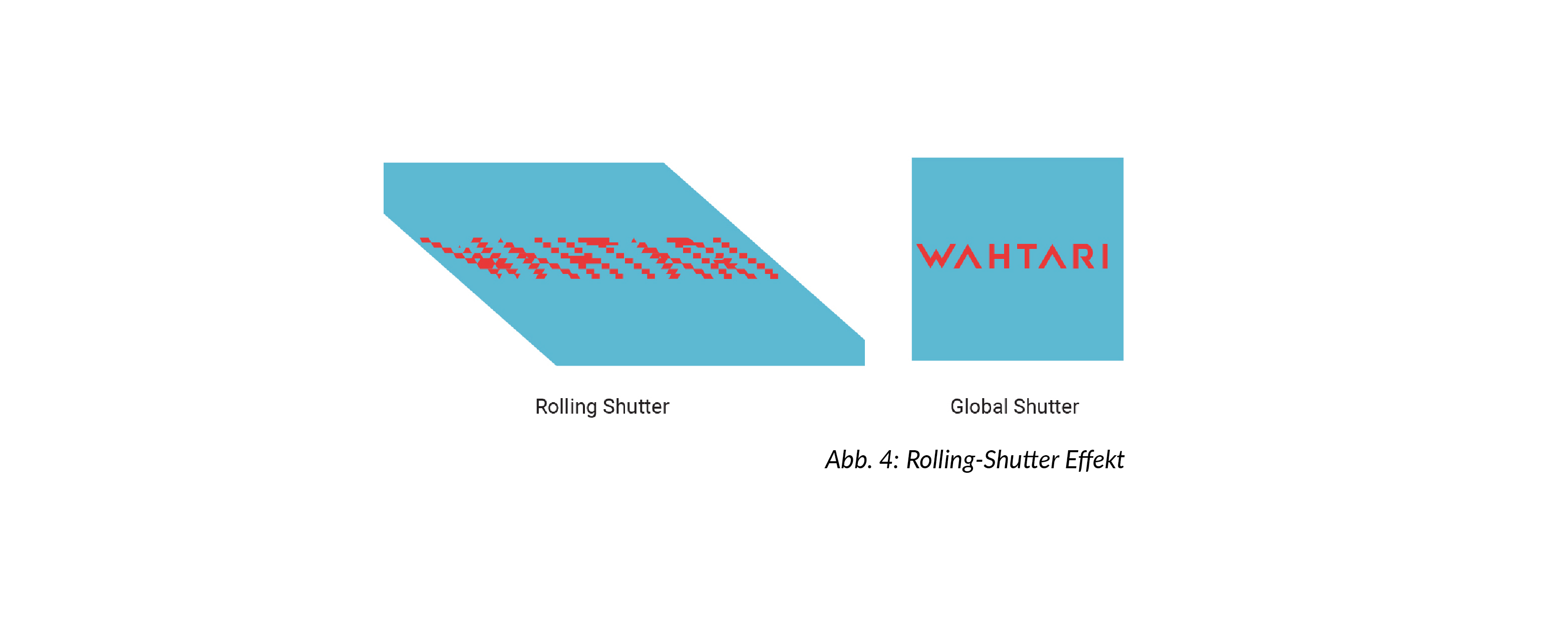 Während ein Global-Shutter-Sensor Bewegtbilder korrekt darstellt, da das bewegte Motiv als Ganzes abgelichtet wird (Momentaufnahme des ganzen Bildes), kann es bei Rolling-Shutter-Sensoren zu geometrischen Verzerrungen und Deformierungen kommen (sog. Rolling-Shutter-Effekt).