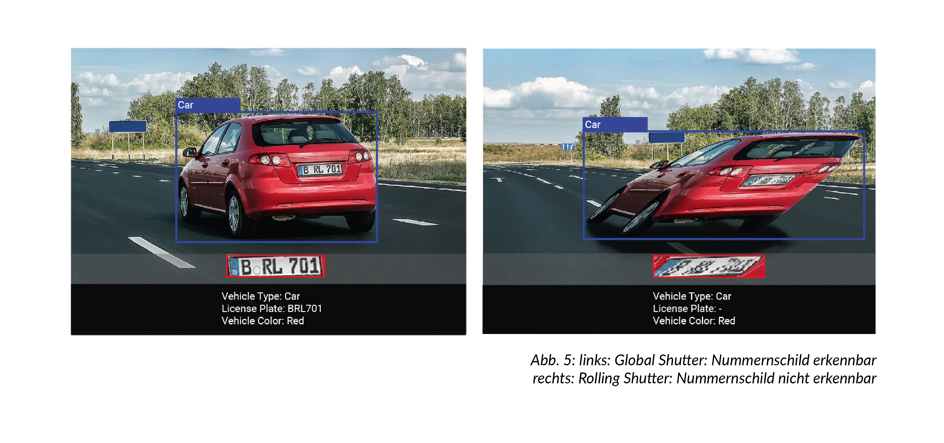 vibrierende und sich bewegende Maschinen, Staub etc.) und ebenso bei der Kennzeichenerkennung im höheren Geschwindigkeitsbereich sind Rolling-Shutter-Kameras sehr fehleranfällig und führen zu verzerrten oder unpräzisen Bildern. Der Rolling-Shutter-Effekt macht sich hier also besonders bemerkbar, erschwert die Bildauswertung oder macht sie sogar unmöglich.