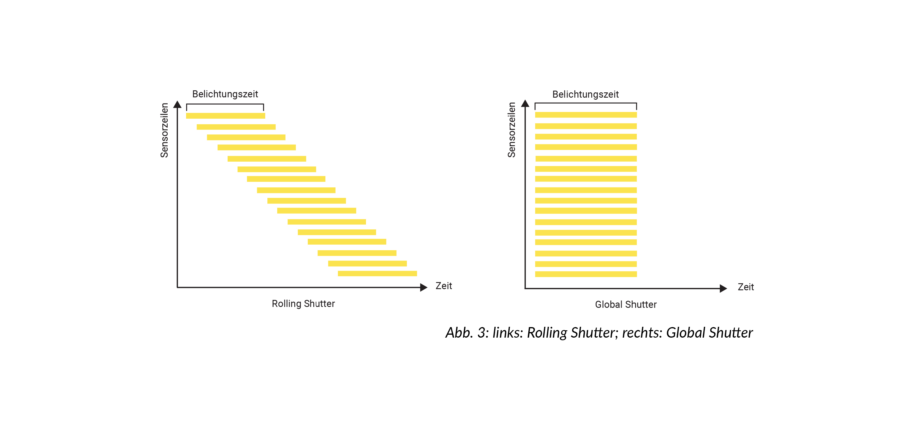 Während ein Global-Shutter-Sensor Bewegtbilder korrekt darstellt, da das bewegte Motiv als Ganzes abgelichtet wird (Momentaufnahme des ganzen Bildes), kann es bei Rolling-Shutter-Sensoren zu geometrischen Verzerrungen und Deformierungen kommen (sog. Rolling-Shutter-Effekt).