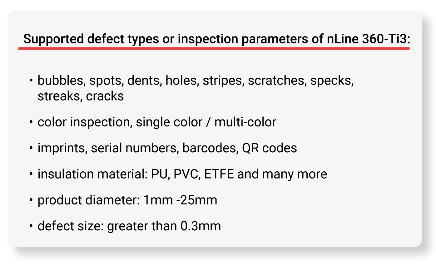 Wahtari nLine 360-Ti3 is the 360° inspection solution for cables and other linear products. Using AI supported image processing, cables can be inspected at speeds of up to 250km/h (~ 4166 m/min) during operation – i.e. inline.